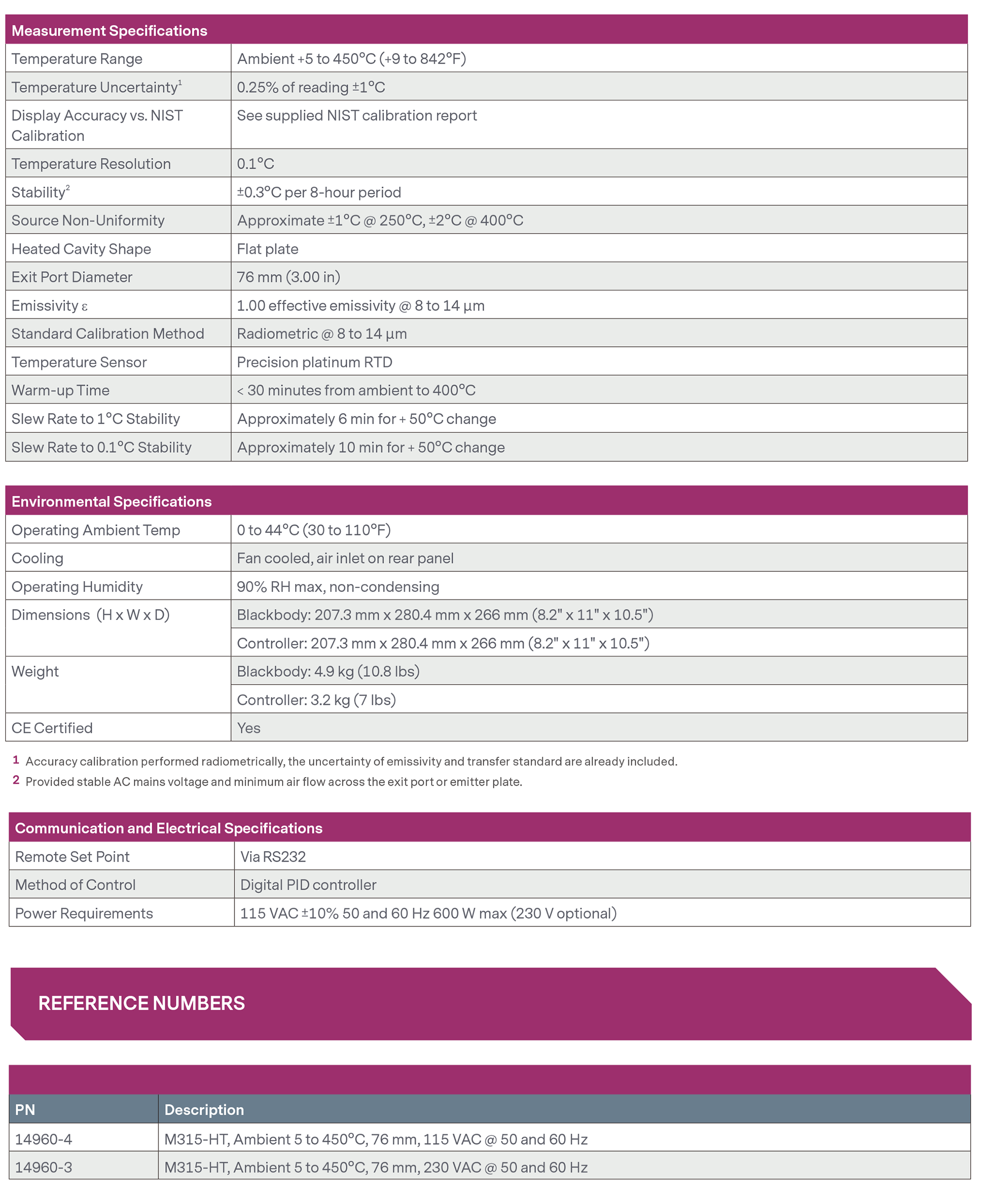 M315-HT是一款大表面積低溫黑體校準源,溫度范圍環境溫度+5℃至450℃,帶有數字指示溫度控制器,可在環境溫度5至450°C(9至842°F)之間的任何溫度下進行設置。一旦設定,通過內部RTD傳感器將源溫度控制在±0.3°C范圍內。該裝置在8至14微米處的發射率為1.00。