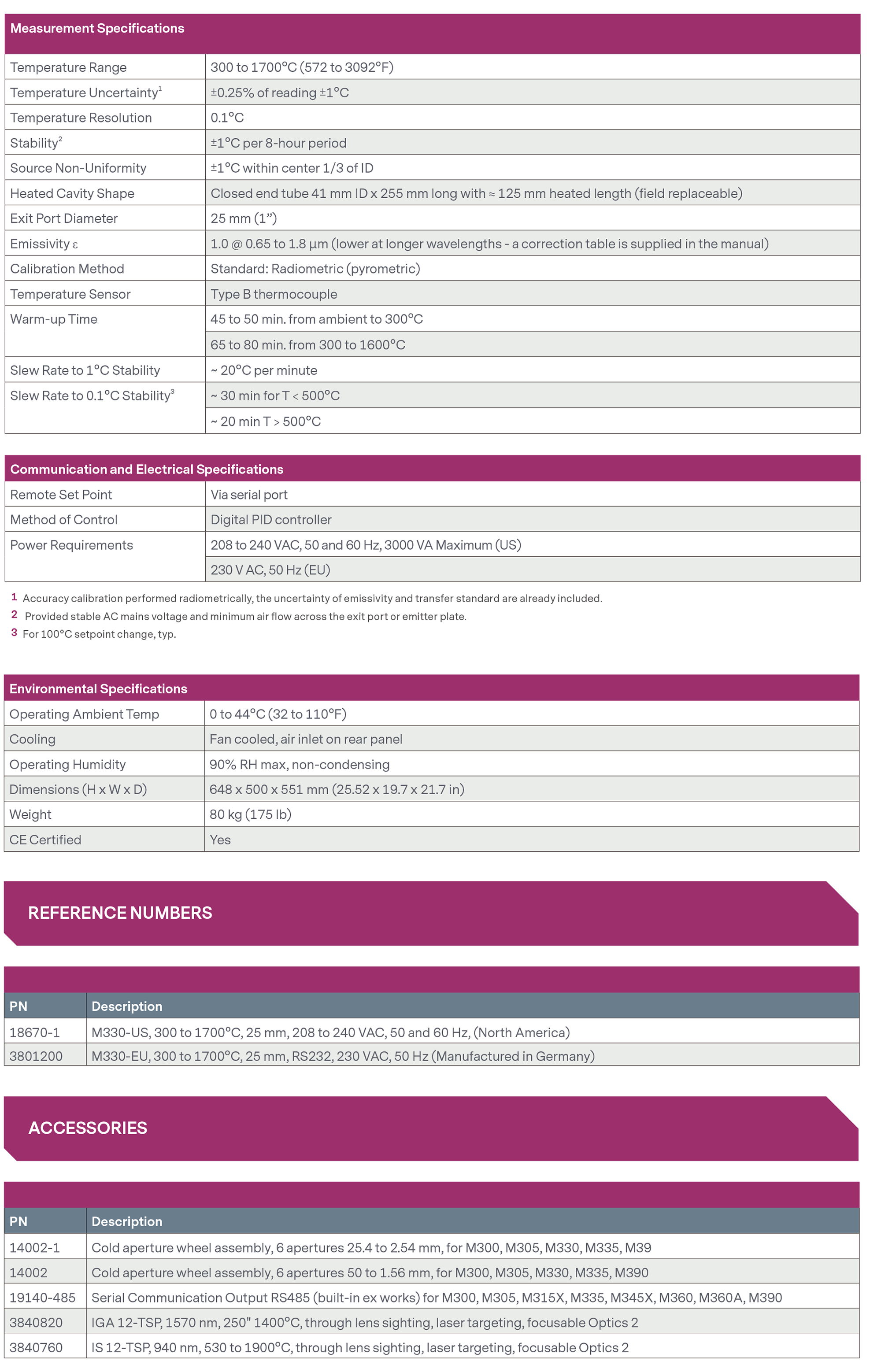 Mikron M330黑體校準(zhǔn)源是一款性?xún)r(jià)比很好的高溫黑體,能產(chǎn)生300- 1700℃內(nèi)的任意一點(diǎn)的溫度,可以在80分鐘內(nèi)快速升溫到1600℃;內(nèi)置自整定PID控制器保證高精度、高穩(wěn)定性;內(nèi)置過(guò)熱報(bào)警截止系統(tǒng)確保升溫安全;內(nèi)置風(fēng)扇確保整個(gè)腔體保持在安全合適的溫度范圍內(nèi)。M330是高溫黑體校準(zhǔn)源非常理想的一個(gè)選擇。